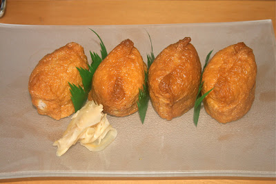 I find cooking rice for sushi challenging: you need to buy proper sushi rice and then wash it several times in cold water, until the water runs clear. And then cook it by absorption. The doses are about 1 and 3/4 (three quarters) cups of sushi rice for 2 cups of water, but that depends on the type of pot. You need a pot with a good lid, or you will loose too much steam. I kind of regulate myself by ear now, since I know my pots and pans. Bring the pot to boiling point, lower the heat and simmer until all the water has been absorbed. Once the rice is ready pour it into a bowl and stir it with a wooden spatula, cooling it with a fan if you can. I then add some ready made sushi vinegar, about 2 tablespoons, but this is my personal taste. If I don't have sushi vinegar I use 2 tbsp of rice vinegar, a little sugar and a little salt (to taste, and I don't like to use too much sugar or salt!). I used the rice to fill some inari (Japanese tofu pockets), which you can buy already made from Asian stores. This time I also put a piece of avocado inside each inari, but this is not exactly 'traditional'.
