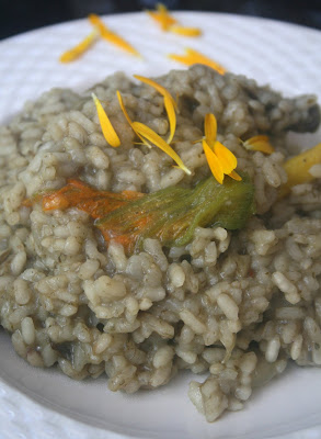 To assemble, divide the risotto between 6 plates, with one baby zucchini for each plate, sprinkle with calendula flowers, and enjoy.