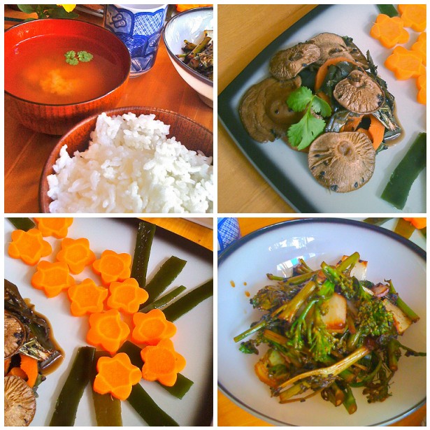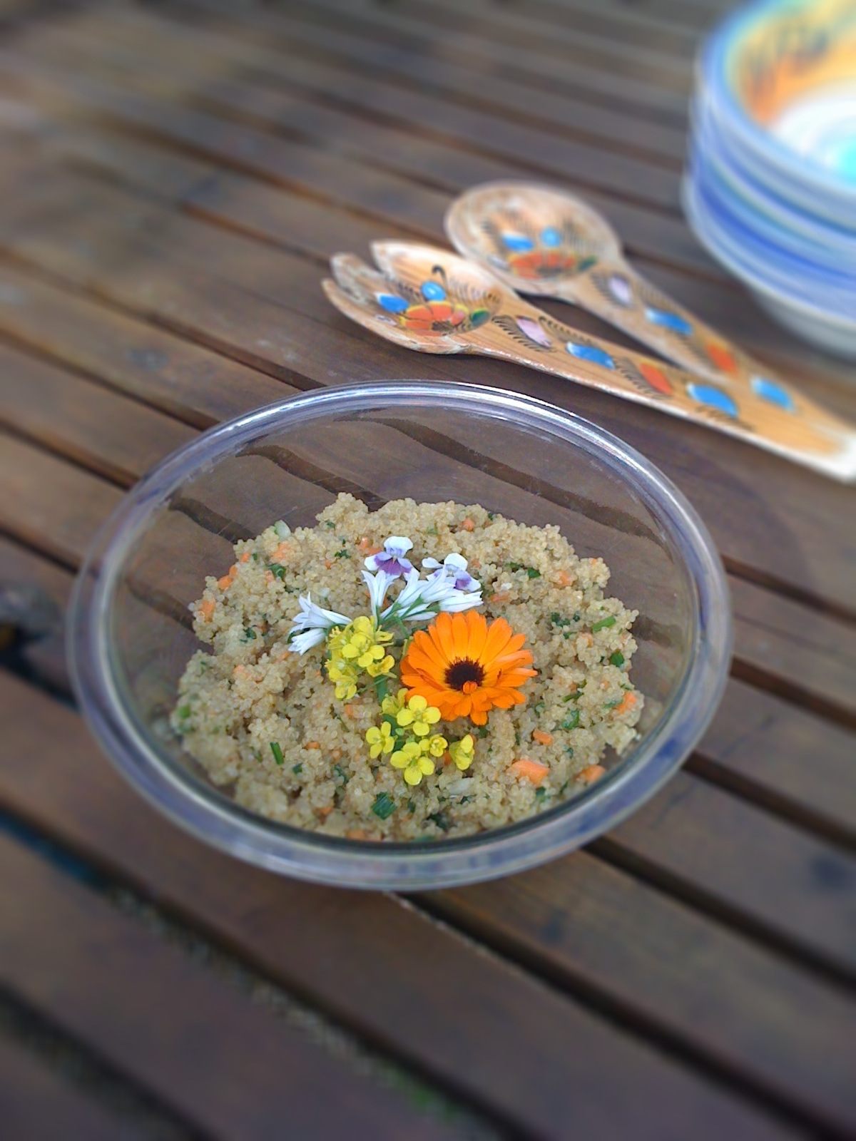 Cook one cup of quinoa with two cups of water for 20 minutes. In the meantime chop very finely a small carrot, a small cucumber and a bunch of onion weeds (or spring onions). Put the still hot quinoa into a serving bowl, add two tbsp of extra virgin olive oil, the chopped vegetables, the juice of half a lemon and salt and pepper to taste. This dish can be served warm or cold (yes, even if it has cucumber it can be served warm!). Just before serving add edible flowers: I used onion weed flowers, marigold, violets and bok choy flowers.