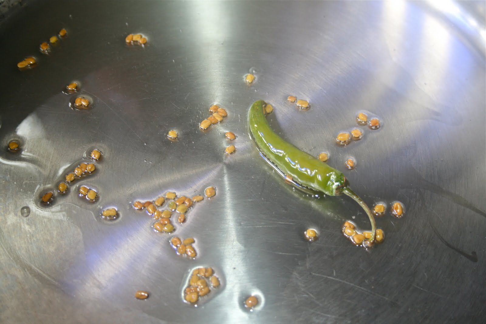Sizzle one tsp of fenugreek seeds and one green chili with one tbsp of vegetable oil.