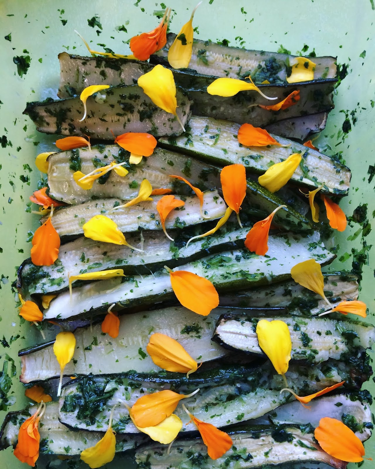 Zucchini with marigold vinegar and marigold fresh petals