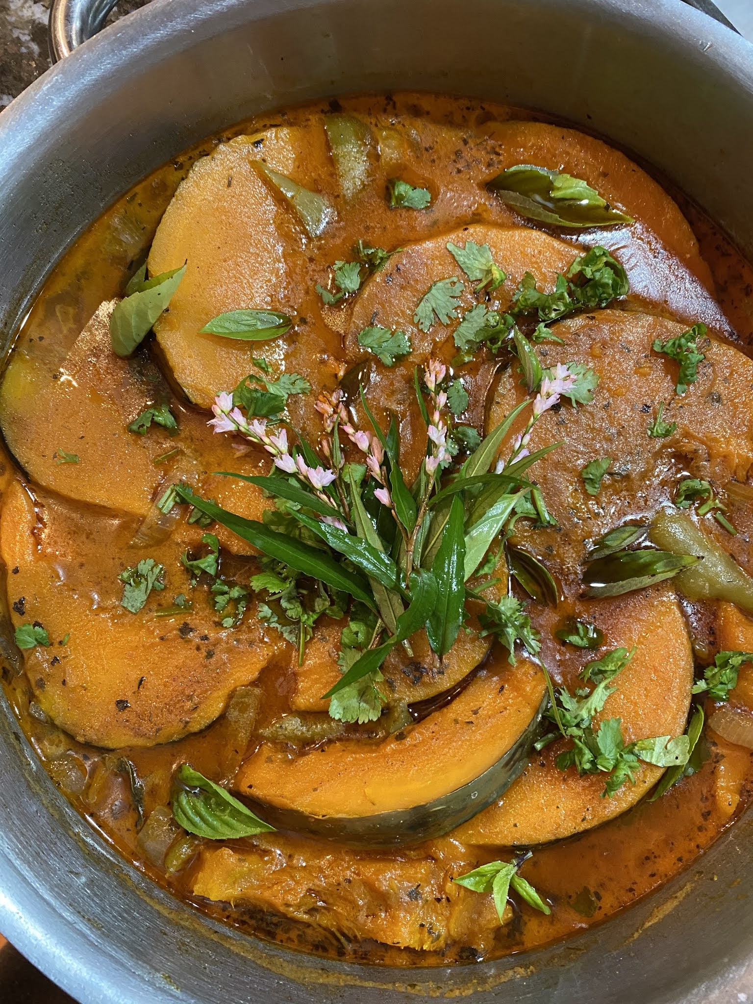 Vegan pumpkin red curry with Vietnamese mint flowers (and a soup with the leftovers)