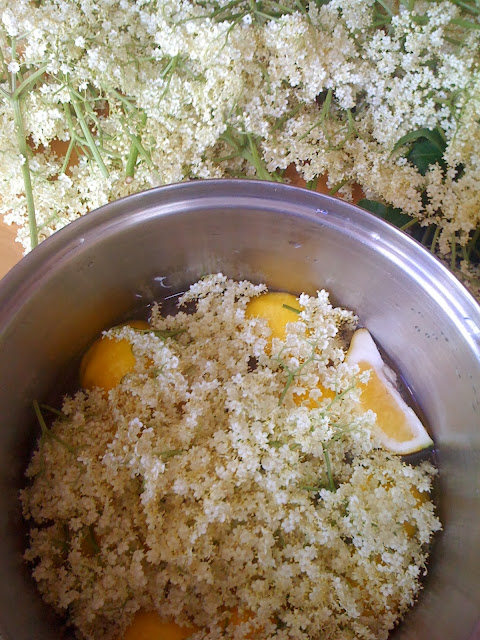 For this you will need 1 l of water, 1 kg of sugar, about a dozen elderberry flower heads, 30 g of citric acid and 3 organic lemons (I picked some juicy organic lemons from Regina's garden).