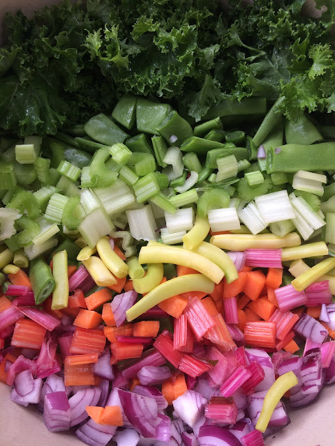 Lovely colourful vegetables from the garden (except the red onions), all ready for a minestrone. From the bottom: red onions, rainbow chard, carrots, yellow beans, silverbeet stalks, celery, green beans, flat beans, kale. Just add water and salt.