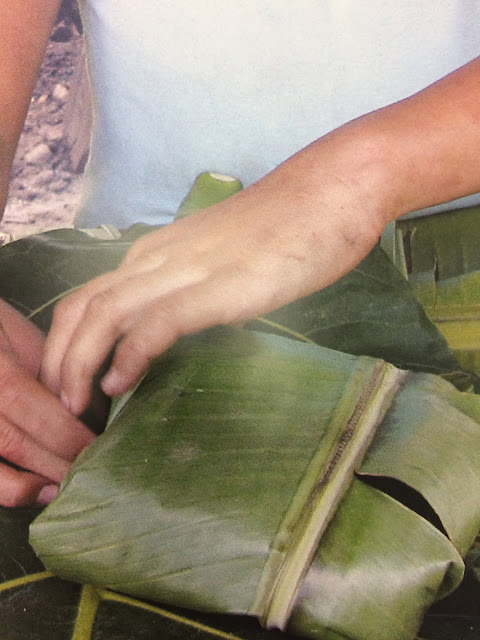 In class we used tin foil and baking paper, but at home I had banana leaves (need to be washed and scorched over a flame to soften and remove the central vein to soften. I used the banana leaves to wrap, and then also tin foil on the outside.