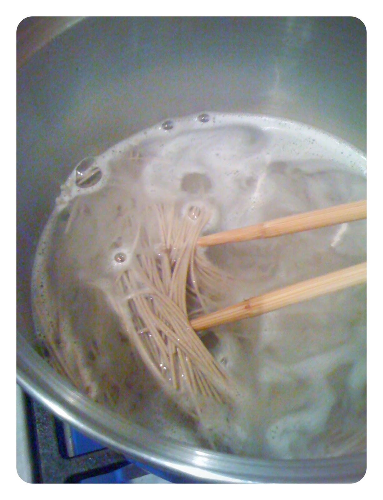 Bring the water to boil: add the soba, stir gently. When the water starts to froth add half a cup of cold water and lower the heat. Do this three times. After the third time your soba should be ready. Drain and collect the cooking water to make soup, if you like (full of starch and vitamins and minerals) and place the soba in a bowl with ice water. Or just rinse under cold water (I prefer this way, the soba may not be perfect but I cannot bear to loose anymore starch!