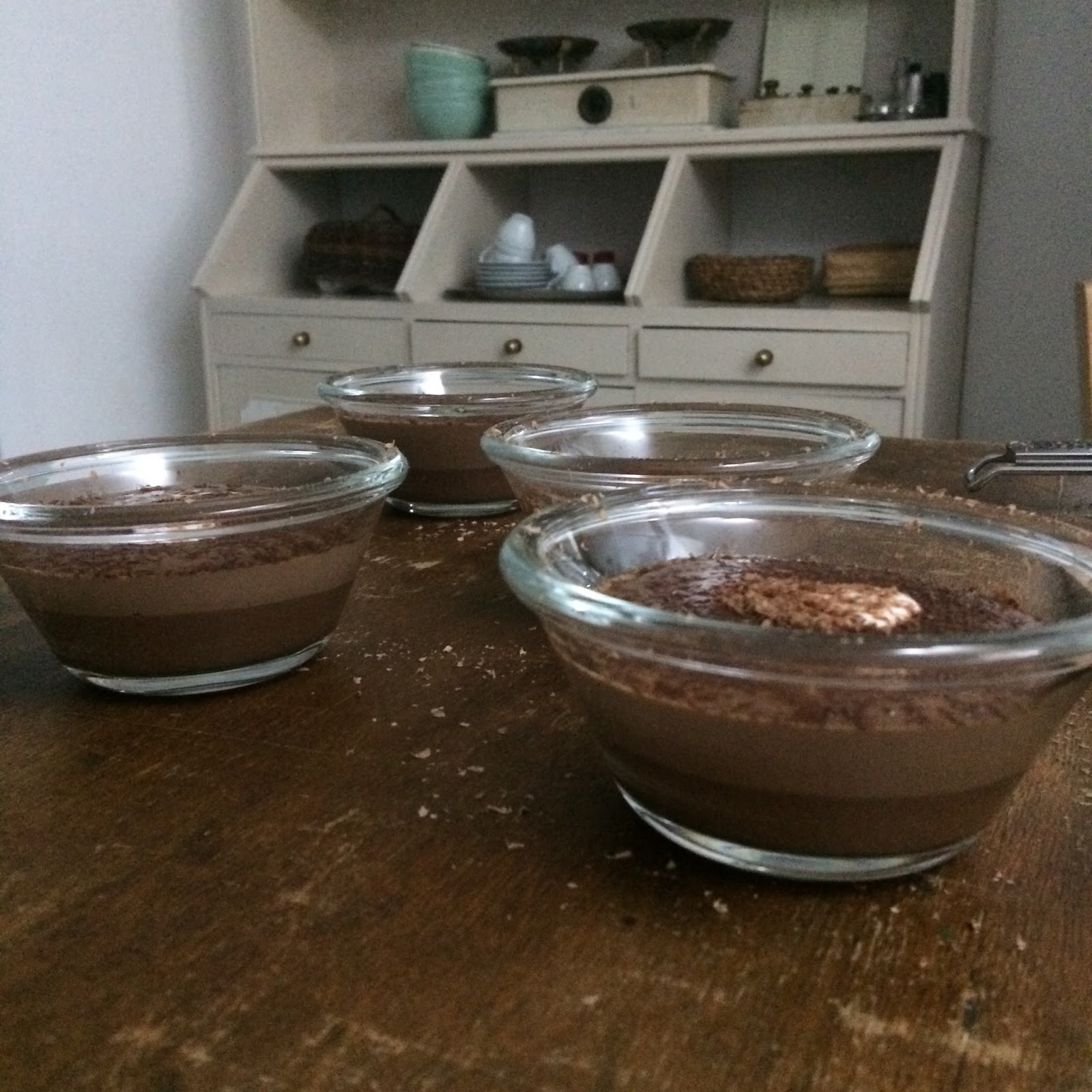 Mix the flour and sugar, add the soy milk slowly and then bring to the boil. Add the dark chocolate and stir until thick. Pour half of the mixture into the bottom of for dessert bowl (better if glass, so you will be able to see the two different chocolate layers - alternatively you can use some pretty glasses).