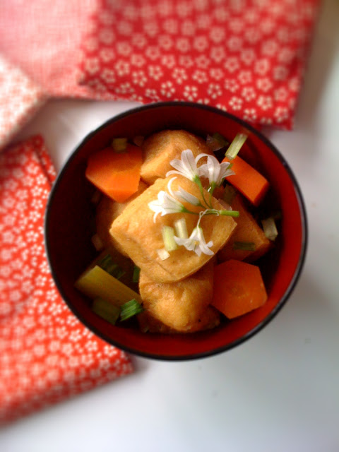 Wash the onion weeds and chop finely. Keep aside (the flowers too). Chop the celery and peel and cut the carrot into thick irregular pieces, I like to make them look a little 'geometric' to look pretty alongside the tofu puffs. Bring the stock to boil, then add the cut vegetables and tofu puffs. Simmer until the vegetables are cooked, drain (keep the vegetable stock aside as you will need it for a sauce and the soup later on - I will publish those recipes in the next few days). Serve the tofu puffs and vegetables in pretty bowls, and top with chopped onion weeds, finishing with some onion weed flowers to decorate (and eat, as they are edible). Serve with soy or tamari sauce.
