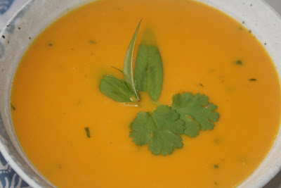 In the end the pumpkin was so soft that I could cut it with a spoon! I removed the skin and seeds and placed it in a pot with the onion. I added vegetable stock and then I blended everything. Finally I added one can of coconut cream and simmered it for 15 minutes. I turned the stove off, then I added some fresh chopped coriander and a couple of stalks (with leaves!) of fresh Vietnamese mint (to be removed before eating).