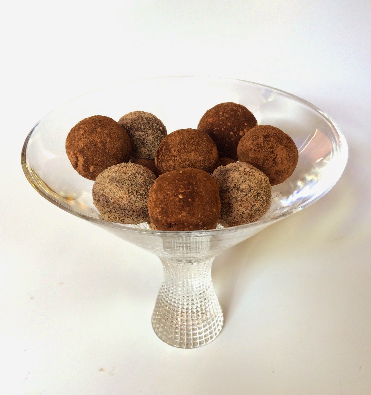 Add the cinnamon, cocoa and hazelnut powder and mix with a spoon. Shape into 12 balls and roll half in cocoa and half in hazelnut flour. The best way to do this is roll the truffles first in cocoa or hazelnut flour, and then pass them between the palms of your hands quickly a few times so that you will get an even coating, and not too much of it, just the right amount. No need to refrigerate, just let them dry a bit on a tray before piling them into a serving bowl or glass.