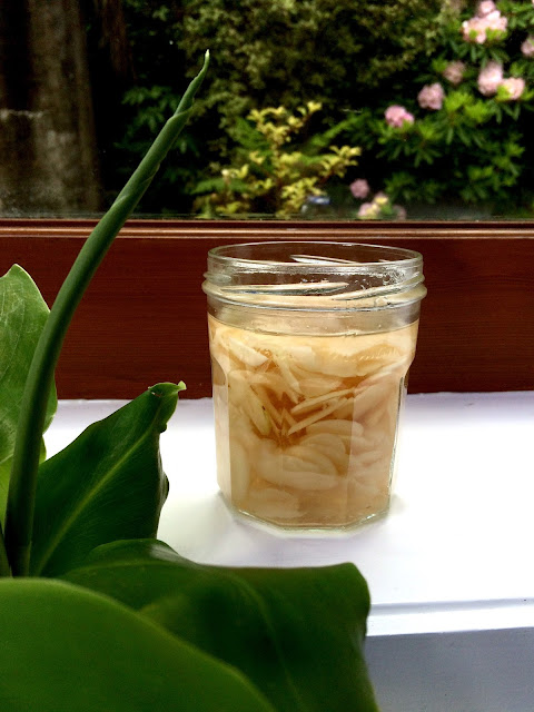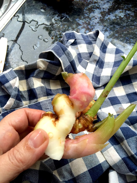 To make gari, the lovely pink pickled ginger for sushi, you need to have very fresh ginger roots, which are not to easy to find. So I grew my own! Bough ginger roots sometimes have a little green bud, or develop one if you leave them outside the fridge, and in this case you can just break a piece off (the one with the bud, of course) and plant it! I did just this, not knowing what to expect, and I was rewarded with a big leafy ginger plant! When I 'harvested' the roots they were fresh and fragrant, perfect for making gari.