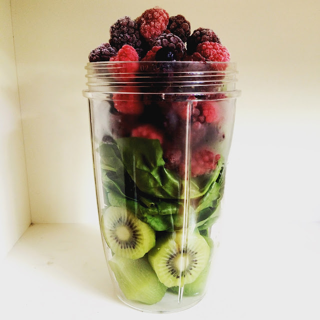 So yummy: Kiwi, baby spinach leaves and frozen mixed berries, plus some coconut water.