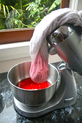 I improvised and hanged it over my kitchen mixer (btw, this is a very new purchase, and it changed my life!!!) Collect all the juice. I had 400 ml. You can squeeze the remaining petals over another cup, and make a sweet cup of rose tea, yum!
