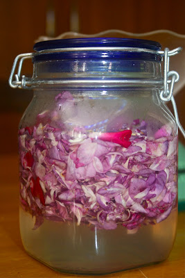I poured the hot syrup over the roses and stored the jar away for two days, in a dark cupboard.