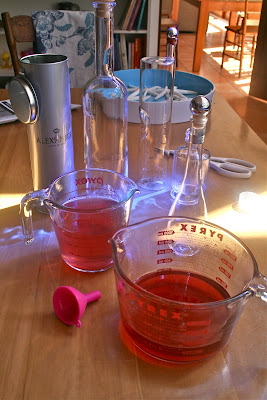 Now to my distillery! I decided to do a 50% alcohol, using a 40° grappa. So I got 800 ml of liqueur, which I put in pretty bottles.