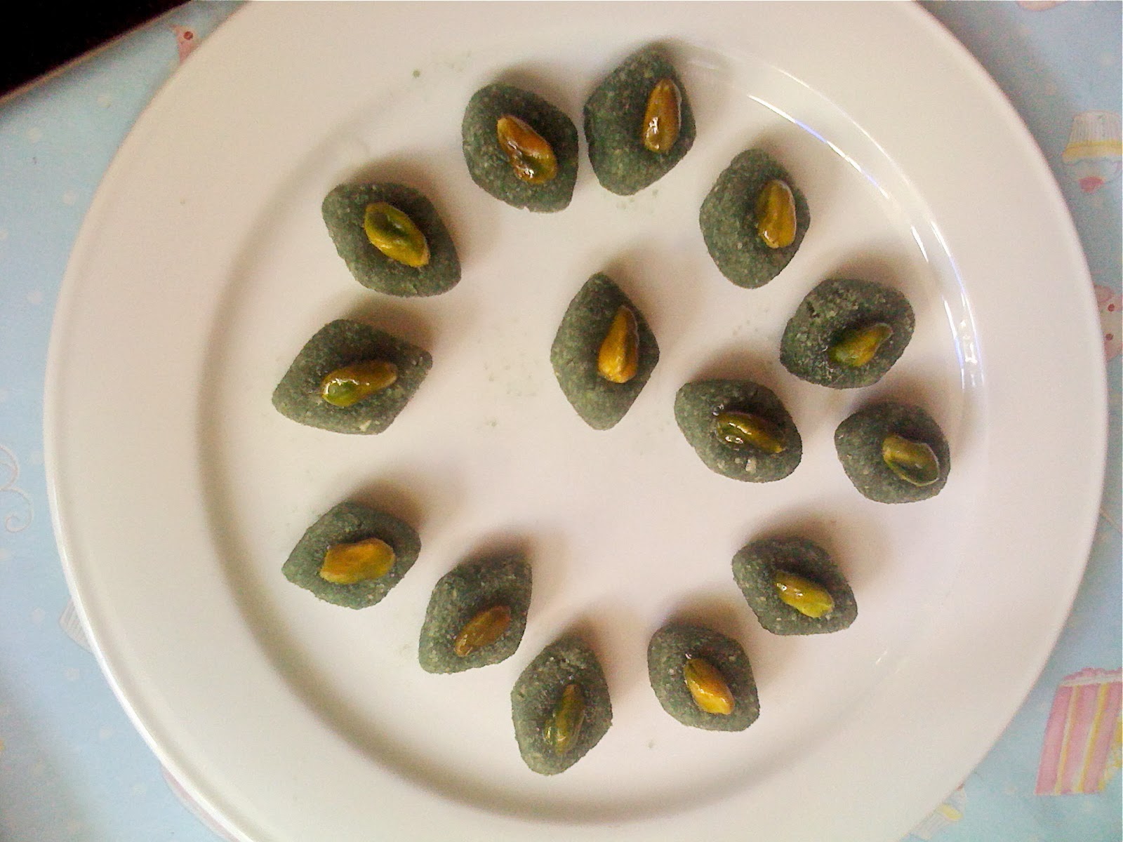 Fresh As raspberry powder, and also quite a bit of spiraling powder for a darker green hue. The nuts on top are optional, of course.