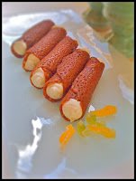 Sicilian Cannoli. Today I chopped a few pieces of candied fruit (green melon and papaya, because I didn't have any candied citrus fruit) and mixed it with ricotta. I also added 1 tsp of vanilla icing sugar (icing sugar kept in a tin with a vanilla pod) and then I wanted to add 1 tbsp of orange blossom water, but it was out of date, so I added rose water instead. I will use the old orange blossom water for my bath (why through it away when you can have a sweet smelling bath!). I thinned down the ricotta with a little milk until it was soft, and piped it inside the Brandy snaps. But you don't have to stick to this recipe: add what you like, for example chopped dark chocolate, ground pistachio nuts, a little cinnamon... anything that sounds Mediterranean! I hope that you will like the idea!