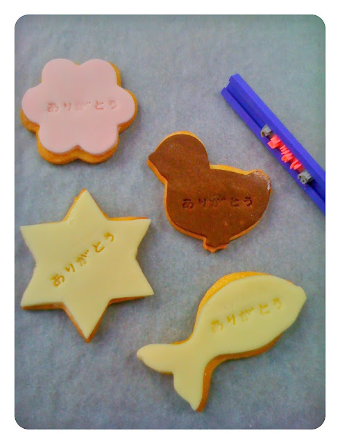 Actually, the set instructions were for using the stamps before baking the biscuits, so we tried, but after baking the biscuits it was a little hard to read the words. Maybe next time we will need to press the stamp harder, or bake the biscuits a bit more, so that the words are legible, but it works fine on icing, since you don't need to bake that! Anyway, here are the photos of the first experiment (I forgot to take one of the baked biscuits though!) to show you what the printing set looks like.