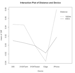 OK, back to the analysis. After typing all of the data into Excel (I had to record it by hand at the track using a data collection sheet and a clipboard like some kind of hobo), I imported it into R and got to work. First, I ran the "full model" which included track, speed, distance, and device, plus all interactions between speed/distance/device.