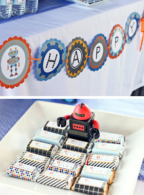 I love how she styled the table - adding fun DIY crafts like the circle robot crepe paper "flags". She used the printable robot from the banner and double matted it with cardstock and made a crepe paper fan for the backside.
