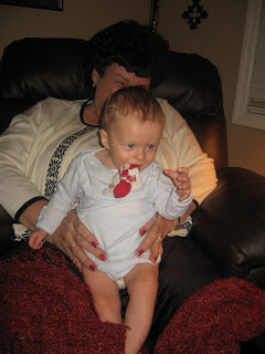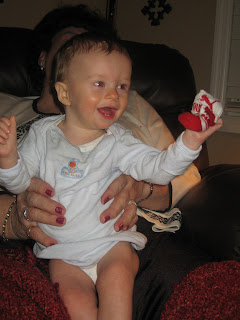 Having fun with his octopus that talks in different languages... sitting on his Grandy C's lap! He thought it was hilarious this one night when we would drop it on the floor all drastically and then pick it up.
