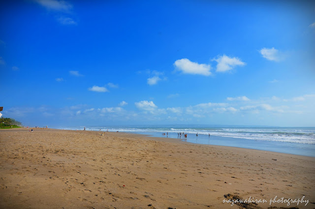 Lepas lunch kami ke pantai pulak. Dah hari ke-4, baru la dapat pergi pantai. Kami ke pantai Seminyak. Memandangkan masih panas lagi, kami duduk-duduk sambil baca buku sambil menikmati angin pantai yang sangat kuat. Ombak sangat kuat dan besar. Mungkin ada gempa susulan kat laut kot. Tak ramai yang mandi laut. Kebanyakkannya berjemur je. Tak pun setakat main ombak kat tepi pantai je. Kami pun sama. Tak berani nak berenang jauh. Setakat main-main dengan ombak. Pasir pantai dia agak kehitaman sikit. Mungkin disebabkan lahar dari gunung berapi kot. Ingatkan nak tunggu sun set, tapi nasib tak menyebelahi kami. Petang tu, awan banyak pula.