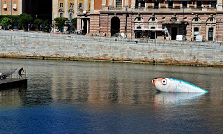 Two statues resembling moais - Easter Island statues - in the Nacka Strands district of Stockholm