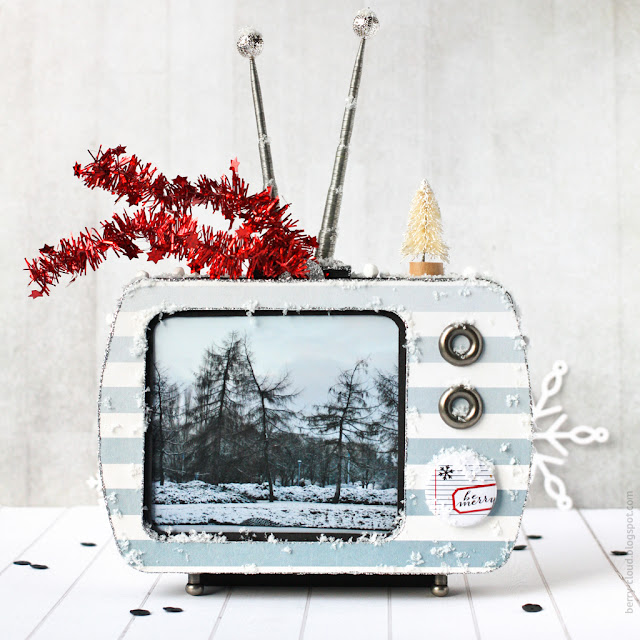 У меня сложилась зимняя рамка для фото в виде ретро-телевизора, или телевизора-приёмника, кому как нравится. Конструкция сделана с нуля, из переплетного картона, скрапбумаги, металлических украшений, проволоки, бусин, рождественской фишки, глиттера и еще нескольких сподручных материалов.