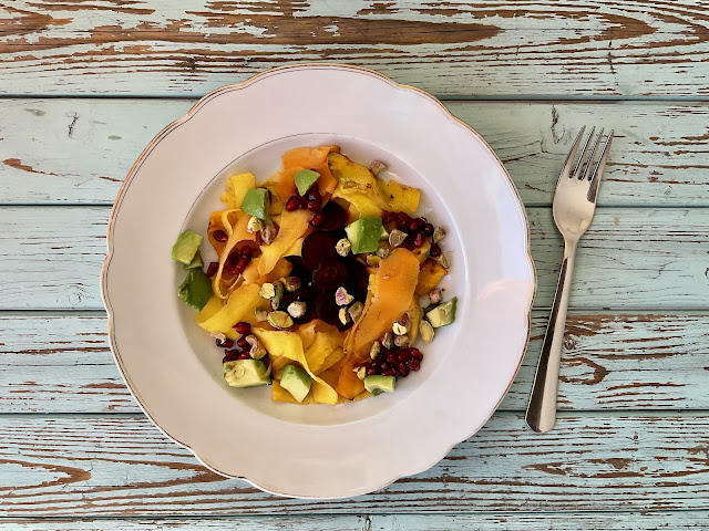 Meine letzten Möhren und Rote Bete aus dem Hochbeet landeten zusammen mit Avocado, Granatapfelkernen und Pistazien in diesem köstlichen Salat.