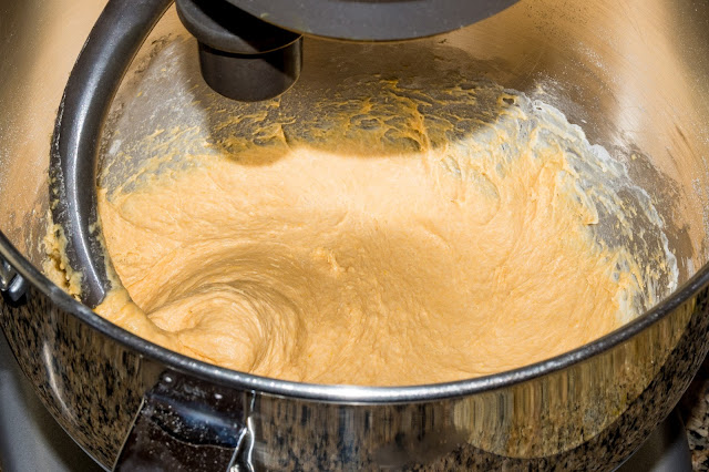 The deep orange flesh of the yam/sweet potato colors the dough, but the rich color of the vegetable is muted by the time it mixes with flour.  To my surprise, I didn't have any dry milk.  I must have finally used up a package and unceremoniously put the empty package in the trash.  You'd think a person would remember that--kind of like finishing up a bottle of Tabasco sauce, but I don't think I've actually done that.