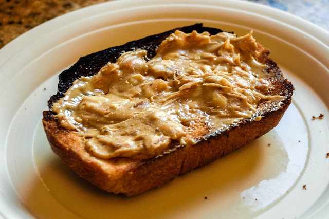 This tendency to over-brownness especially applies when you're making toast.  (Toast with peanut butter may be the ideal way to eat this bread).  You do have to watch the toaster or you'll end up with burned edges.  And I mean burned, not just dark brown.    Not too serious, as long as it's just around the edges.  Fruit, carbs, and protein, all in one slice of toast!  Efficiency at its finest.