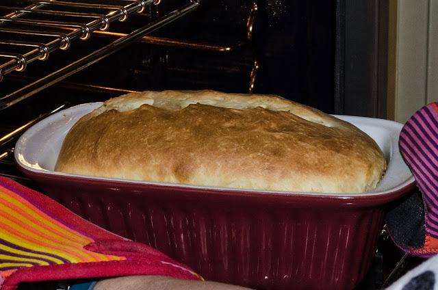 The rest was easy enough--so easy that Jim missed shots of the shaped dough going into the loaf pan, as well as shots of me slashing the bread.  I actually think he may not like being in the same room with me when I'm armed with the bread slasher.