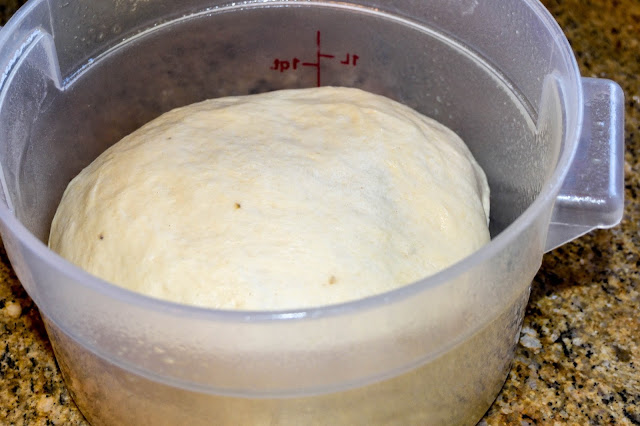 After being in the refrigerator for 24 hours, it's grown, even though it was brutally punched down for the first few hours of its stay.  Apparently pita bread dough has a masochistic streak.