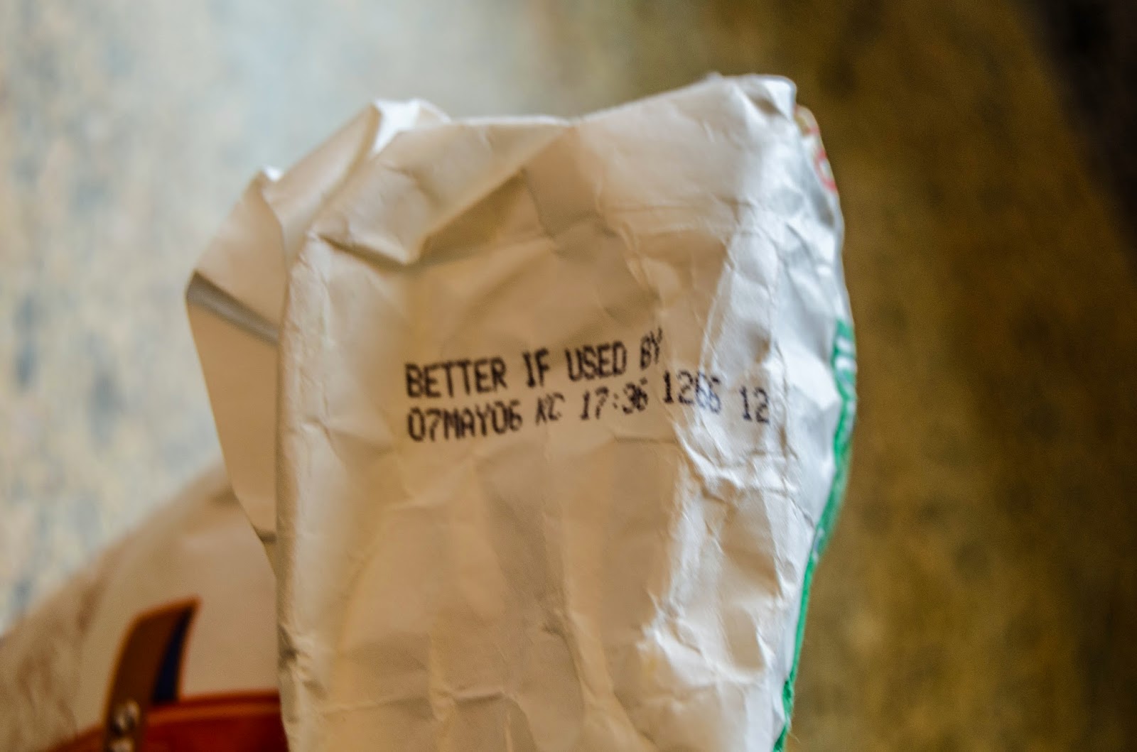 In the first post, I said I had some self-rising flour, but I couldn't find any White Lily because apparently we are too far north (still true).  I knew I had some self-rising flour in my flour cabinet, so I wasn't worried about that.  Just before I started measuring the flour, I had an uneasy feeling that I'd better check the use-by date because, now that I thought about it, I actually couldn't remember buying any self-rising flour in the recent past.  Uh-oh.  Use by May 7, 2006!  This must be the same bag of flour I bought for the biscuits the first time I made them.  I hate to think how this ten-year-old flour would have performed.  I threw it out, and used a combination of bleached flour, cake flour, baking powder, and salt.