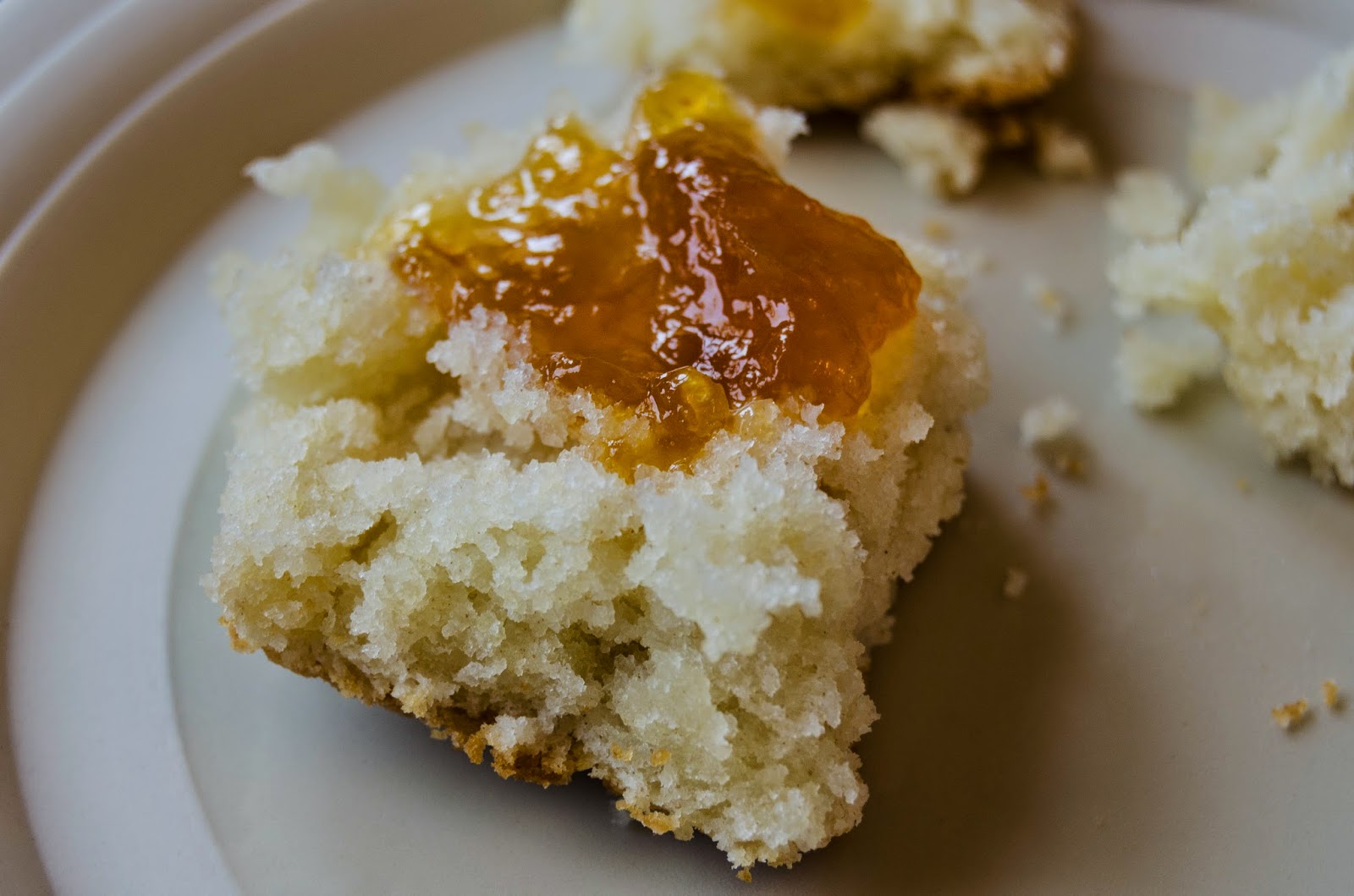 They're darker and not as high as my 2006 pan of biscuits was.  I like the color, but I wish they were higher.  Now that I taste them, I can sort of see why I didn't try to describe them.  I'm not sure I can describe them now.   They were very soft, fluffy, and tender--almost too tender and soft, especially when warm.  They were hard to break apart (even using the fork tine method) when they were warm, and they lost some of their flavor when they cooled.  Jim loves these biscuits--he really gobbled them up.  Some with butter, some with jam, some with butter and jam, some plain.  He liked them all ways.  I think I prefer a more substantial, flakier biscuit that's rolled out and cut with a biscuit cutter.  But I'm pretty sure there are a few more biscuit recipes in The Bread Bible, as well as a few fabulous scones, so by the time we're done, we'll all have our favorite.  Unless, of course, we forget about them before we get to the end of the book.