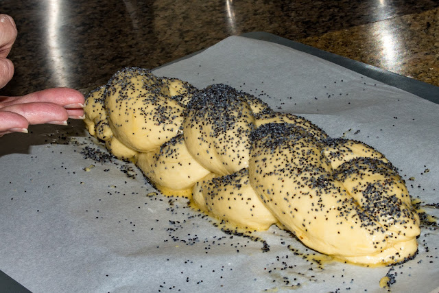 Of course, you can't just decide you want a piece of challah and wander out to the kitchen and bake a loaf.  No, you'll have to do a little planning, especially if you use the biga, as I did.  The biga is just a small amount of flour and water, plus a tiny bit of yeast, left to rise for about 4 hours, until doubled in size and making a few bubbles.  Then into the refrigerator for three days.  No, not three hours, three days.  If it gets pushed to the back of the refrigerator, you may forget that you were making challah.