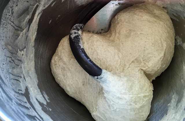 After 10 minutes in the KitchenAid, it's soft and shiny and lovely to stretch.  I added just a few grams of extra water to make it a bit stickier.