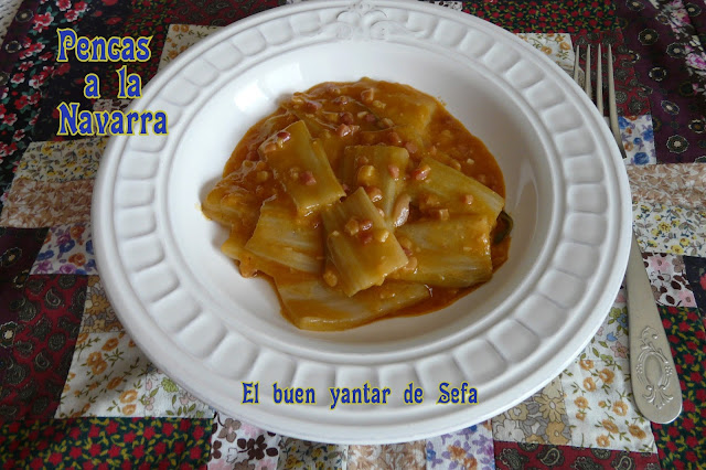 Para servir, poner en una fuente las pencas y sobre ellas añadiremos el jamón y los ajos que hemos reservado.