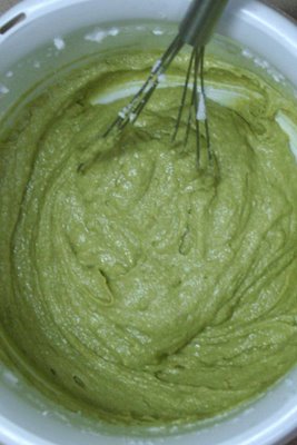 Aqui, una foto del bol con la masa ya lista para el horno. Queda de un color verde precioso, que luego se mantiene en el interior del pastel