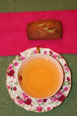 Aqui se aprecia el color que tiene el interior del cake, verde, que contrasta con el dorado de la superficie. Lo he servido con una tacita de un té sueve del Himalaya.