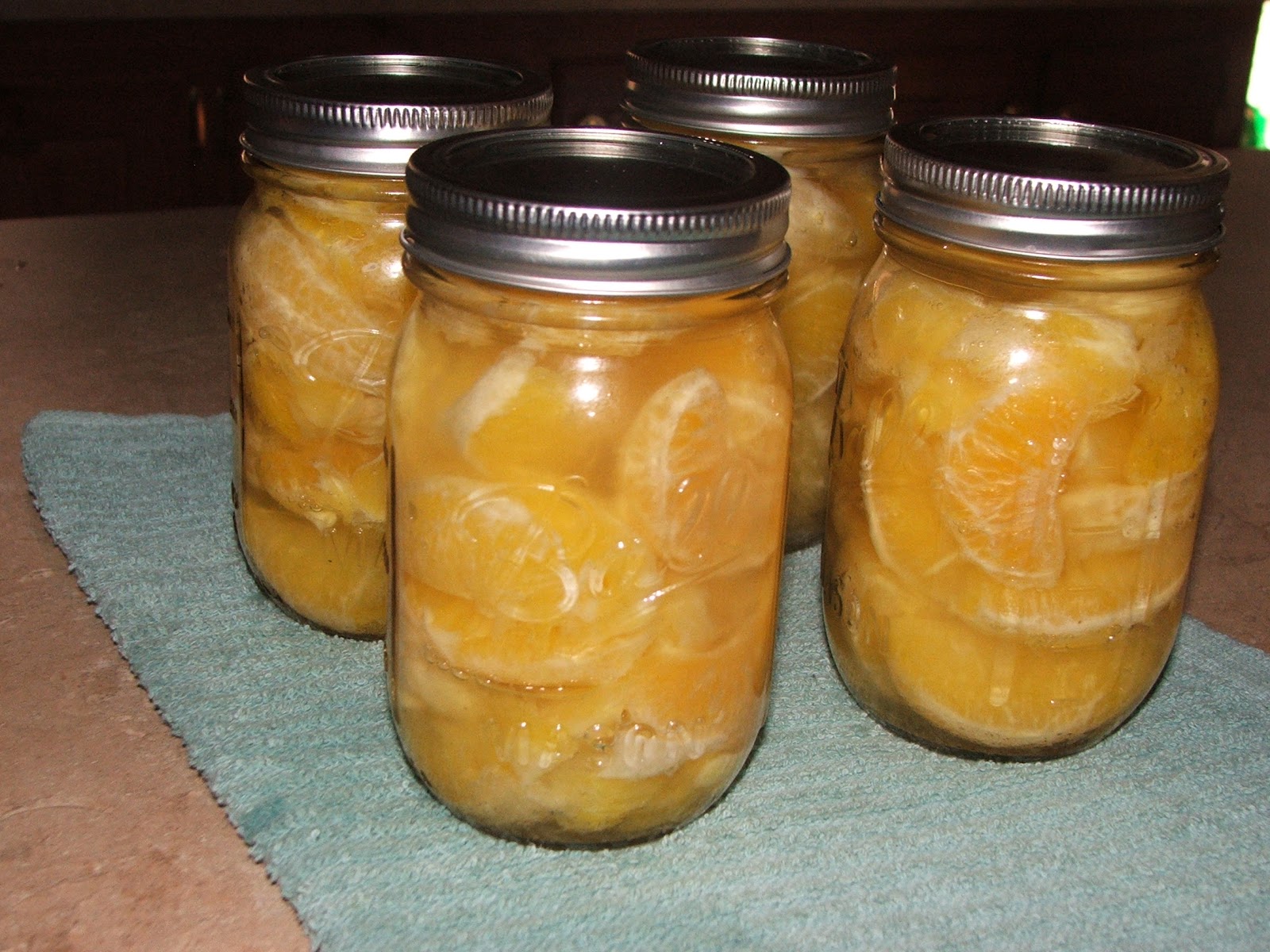 I processed the jars of oranges in a boiling water bath (place the jars in a canner or large pot, ensuring they are completely covered with water, then bring to a boil and start timing) for ten minutes.