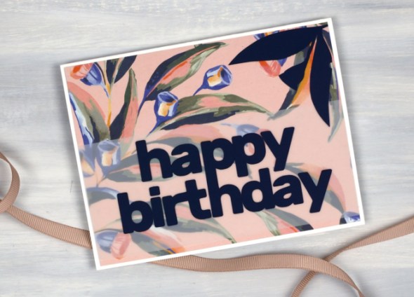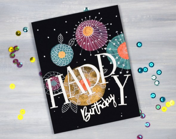 To turn this panel into a birthday card I doodled with white gel pens then cut the HAPPY letters on the cricut and paired them with a smaller die-cut ‘birthday’.