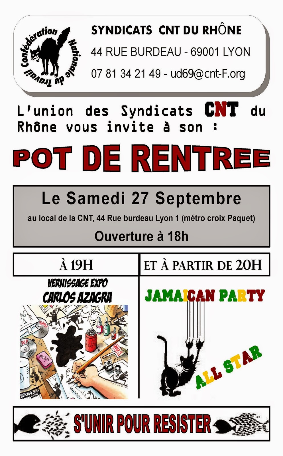 L’Union des Syndicats CNT du Rhône vous invite à son pot de rentrée le samedi 27 septembre, à partir de 18 heures, dans son local 44 rue Burdeau, 69001 Lyon.A partir de 19 heures, vernissage de l’expo de CARLOS AZAGRA, dessinateur.