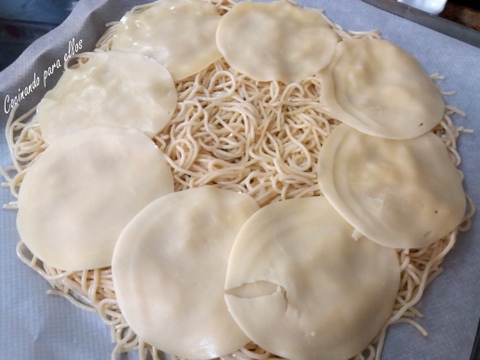 Pasado ese tiempo forramos un molde con papel de cocina, engrasamos las manos con aceite de girasol, ya que se pega mucho y estiramos la masa, no os va hacer falta rodillo yo la estiré perfecta mente con las manos.