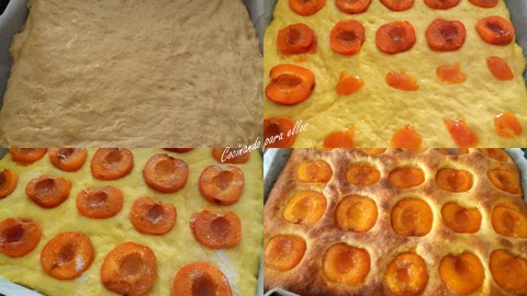 Una vez ha levado, yo le puse una cucharada de mermelada de albaricoque debajo de cada albaricoque( esta fue idea mia), espolvoreamos con abundante azúcar y con el horno precalentado horneamos a 180º durante 30 - 35 minutos.
