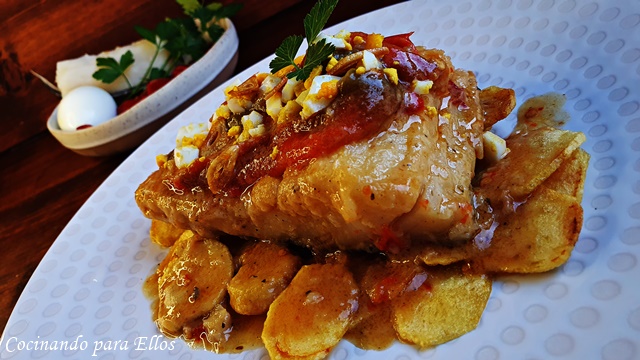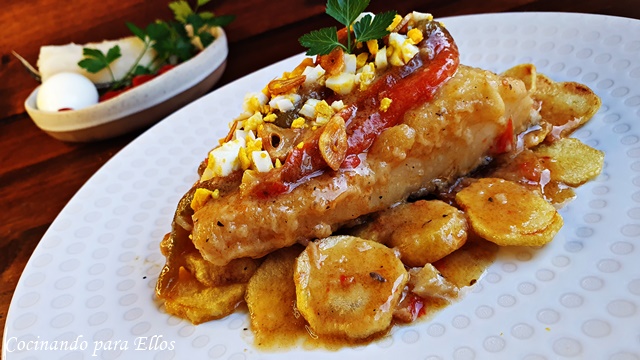Echamos encima del bacalao el huevo picado y unas laminas de ajos que tenemos reservados, sirviendo el bacalao ...