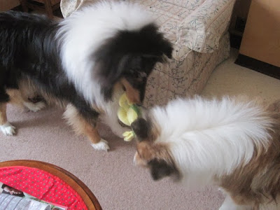 Yesterday morning, Duffy and Lanny engaged in some tug playing with Froggy. And it probably involved some who could claim ownership too!! Only once before has Duffy got involved in a tug game, so I was happy to see this. Duffy has not initiated any play with Lanny, he's just not into toys anymore and if he wants to play, it's with his humans not other dogs. It's like the only child that spends more time with adults than with kids, and consequently always feels more comfortable with them. Ahem--that was me!!