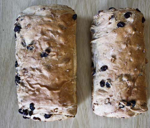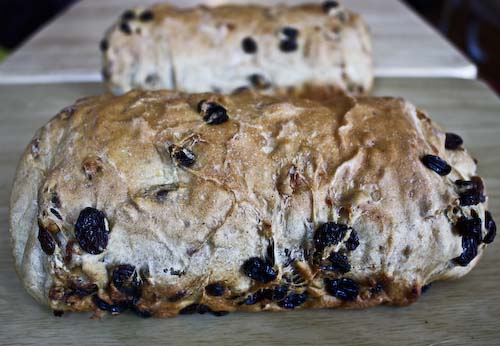 Switch to the dough hook and mix on medium speed for 6-8 minutes. Add more flour if necessary so that the dough forms a nice ball, tacky, but not sticky. In the last two minutes of mixing, add in the raisins and walnuts. The dough should pass the windowpane test (which means that when you stretch it, it thins enough to become translucent to light as though you were looking through a windowpane).