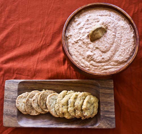 This dip, called muhammara in Arabic (which means brick-colored), is, like hummus and baba ghanoush, a dip of the eastern Mediterranean, although considerably less well-known in the US.  Which is too bad, because it's wonderful.  Although this particular incarnation comes from Aleppo, Wolfert cites its existence in various forms in Lebanon, Georgia and Turkey.  Wonderful with crackers of the homemade variety, it would also be a lovely condiment with meat or fish kabobs or simply with a few grilled pita triangles.