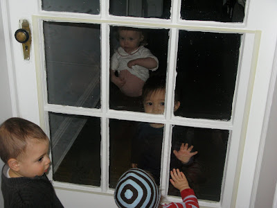 Bee trying to show her belly button while she hangs out with some friends! Oscar, Olliver and Noah! Playing with doors is so much fun for toddlers!